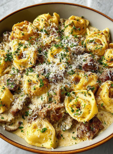 Einfaches One-Skillet Rindfleisch-Stroganoff mit Tortellini